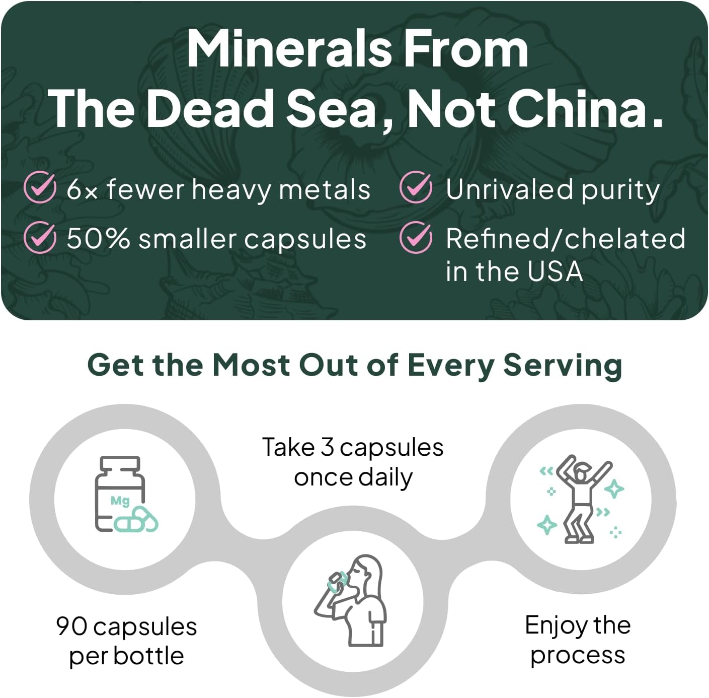 - Sourced from the Dead Sea: Our magnesium and zinc are carefully extracted from the most mineral-rich oceans in the world and then chelated in Utah. Never touching China, the result is a formula boasting unrivaled purity, delivering maximum results and unmatched absorption.